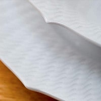 ティーカップ、コーヒーカップ、プレート、ポットなど、すべてに統一性があり、流れるようなラインが生まれます。湖を渡る風によって水面にさざ波がたつように、輝く白磁の上を波のようなレリーフが浮かんでいます。