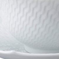 ティーカップ、コーヒーカップ、プレート、ポットなど、すべてに統一性があり、流れるようなラインが生まれます。湖を渡る風によって水面にさざ波がたつように、輝く白磁の上を波のようなレリーフが浮かんでいます。