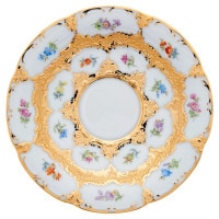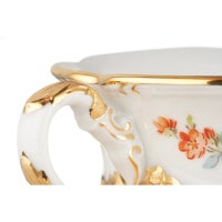 バロック、ロココ、ビーダーマイヤーなど、さまざまな美術様式が渾然一体となったところにこのカップ&ソーサーの最大の魅力があるといえるでしょう。豪華な金彩がそれらを印象づけています。インパクトのある色彩と可憐な小花の組み合わせが印象的。マイセンらしさに溢れた豪華なティーカップです。